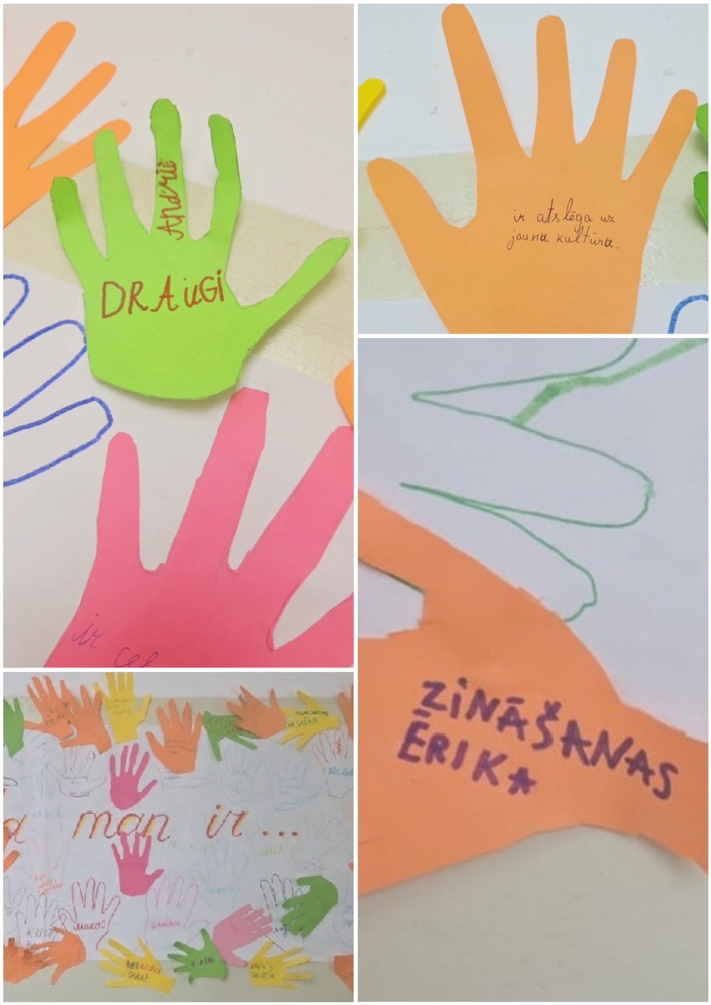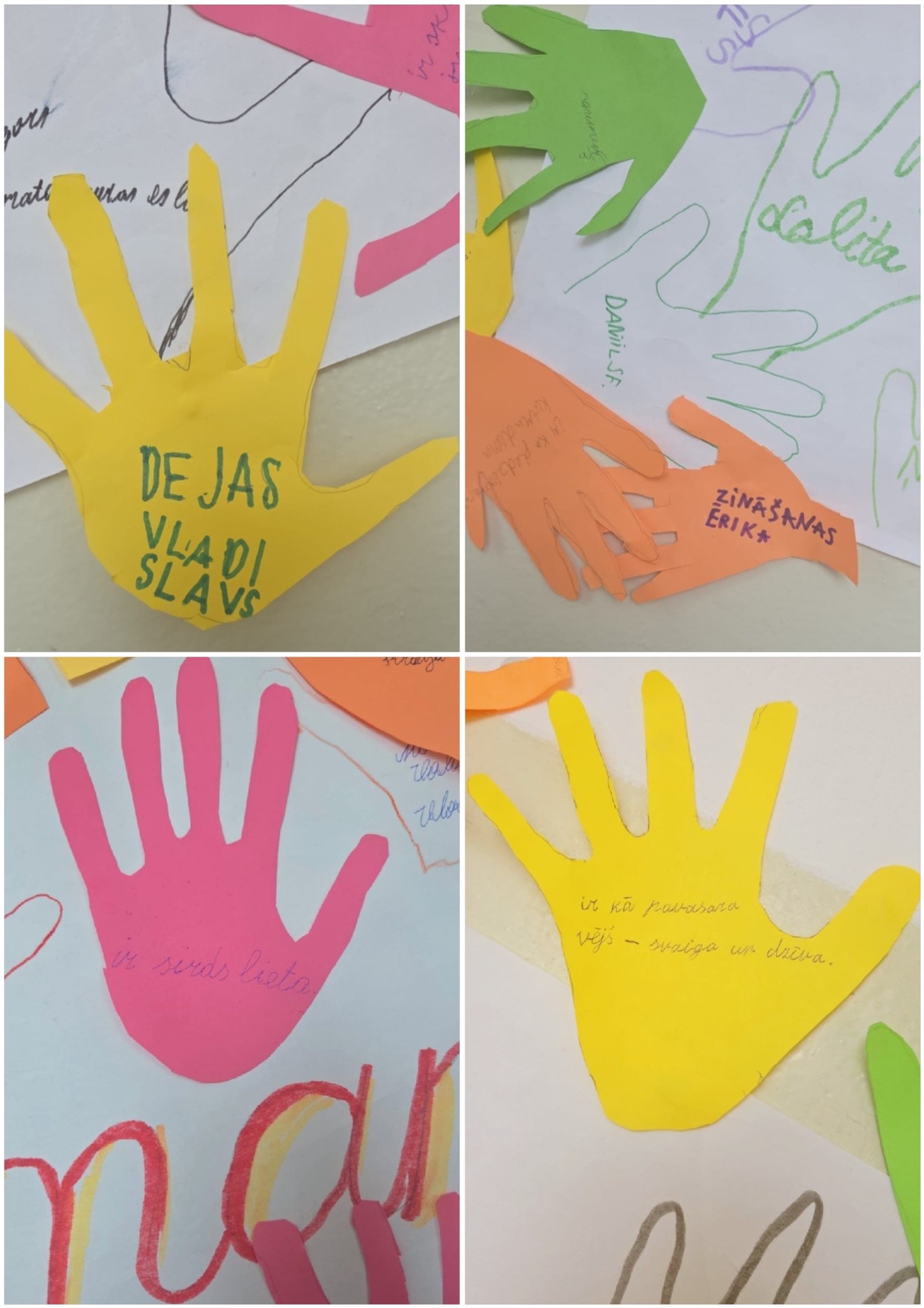 Katrs skolēns uzzīmēja un izgrieza no papīra savu plaukstiņu, uz kuras uzrakstīja – “Latviešu valoda man ir…”