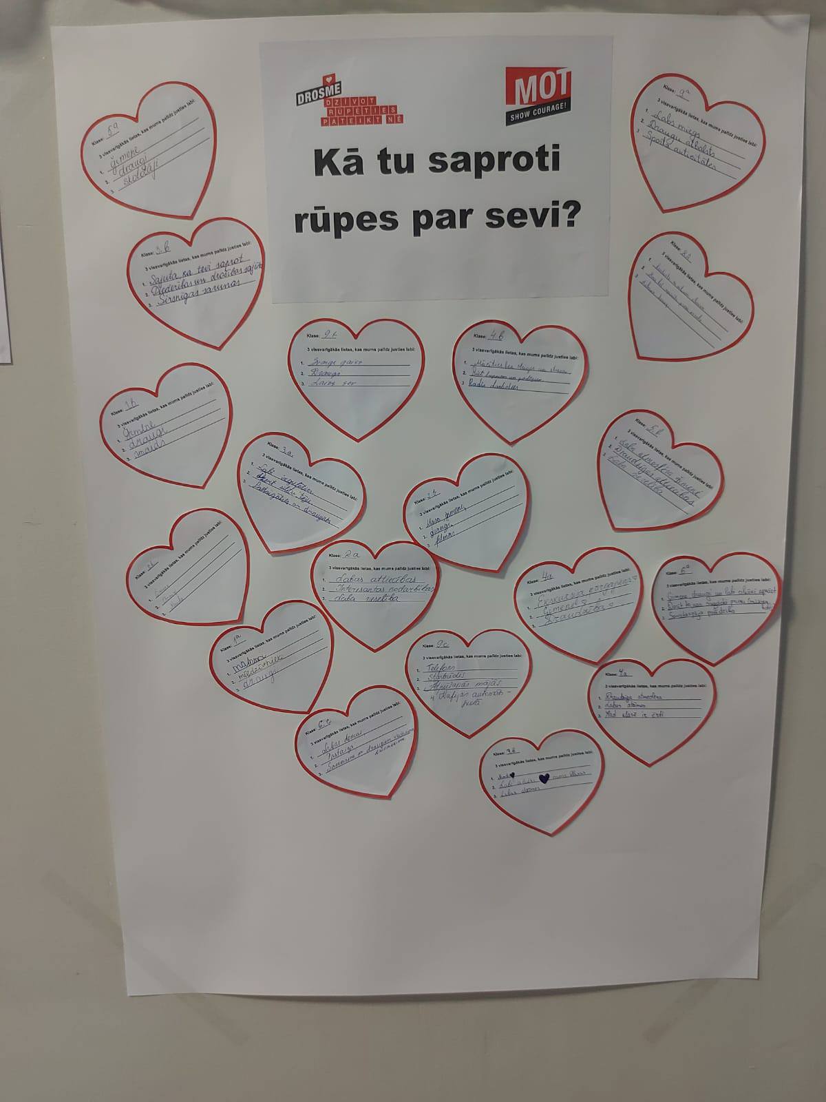20.-23.11.2025 mūsu skolā MOT programmas ietvaros notika nedēļa “Drosme rūpēties”, kuras laikā tika organizētas dažādas aktivitātes. Trešdienas tēma bija “Drosme rūpēties par sevi”. 1.-9.klašu skolēniem notika diskusija “Kā tu saproti rūpes par sevi” (tika izveidots kopīgs plakāts), bet 1.-4.klašu skolēni organizēja rīta enerģijas pauzi. Ceturtdienas tēma bija “Drosme rūpēties par citiem” un dienas laikā notika aktivitāte “Labais izaicinājums” – visi kopā izveidojām plakātu “Mūsu rūpes”. Piektdien tika organizētas klases stundas par tēmu “Drosme rūpēties par sabiedrību un drosme mainīt”. Paldies visiem dalībniekiem un pasākuma organizatoriem! Drosme rūpēties nozīmē drosmi rīkoties!
